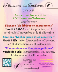 Voici le planning de mes séances collectives pour le premier semestre 2025 au centre Amaranthe, 51 route de Portet à Villeneuve-Tolosane ainsi qu’au centre de kinésithérapeute au 122bis avenue de Lardenne à Toulouse.